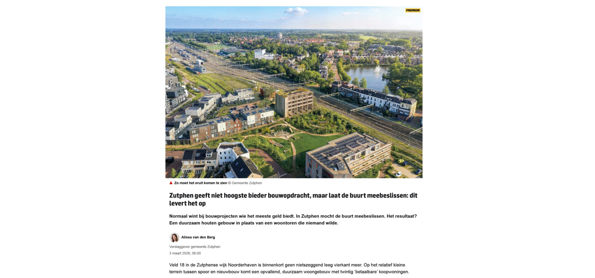 De week begon met een mooie publicatie in de Stentor over ons nieuwe project Veld 18 in Zutphen. Journalist Alissa van den Berg beschrijft hoe de gemeente niet koos voor de hoogste bieder, maar de buurt liet meebeslissen. Het resultaat: een duurzaam houten woongebouw met twintig betaalbare koopappartementen, ontworpen door FARO, in plaats van een omstreden woontoren. Kwaliteit en leefbaarheid stonden voorop.
