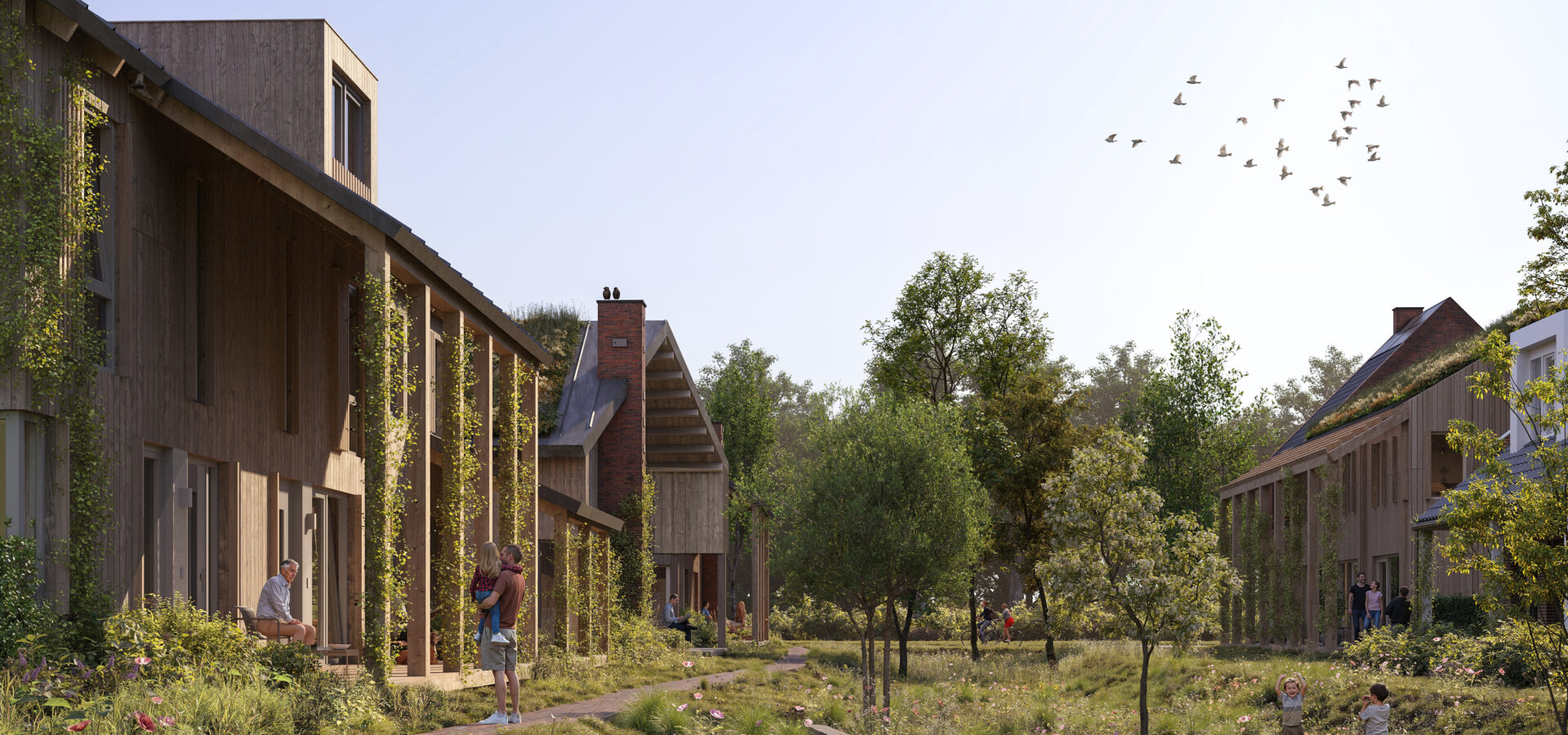 Natuurinclusiviteit vormt de verbindende laag binnen het hele plan. Architectuur, landschap en ecologie zijn vanaf de eerste ontwerpfase integraal ontwikkeld. Nestvoorzieningen, natuurschoorstenen, verticale begroeiing en groene overgangen zijn niet toegevoegd, maar maken intrinsiek deel uit van het ontwerp.