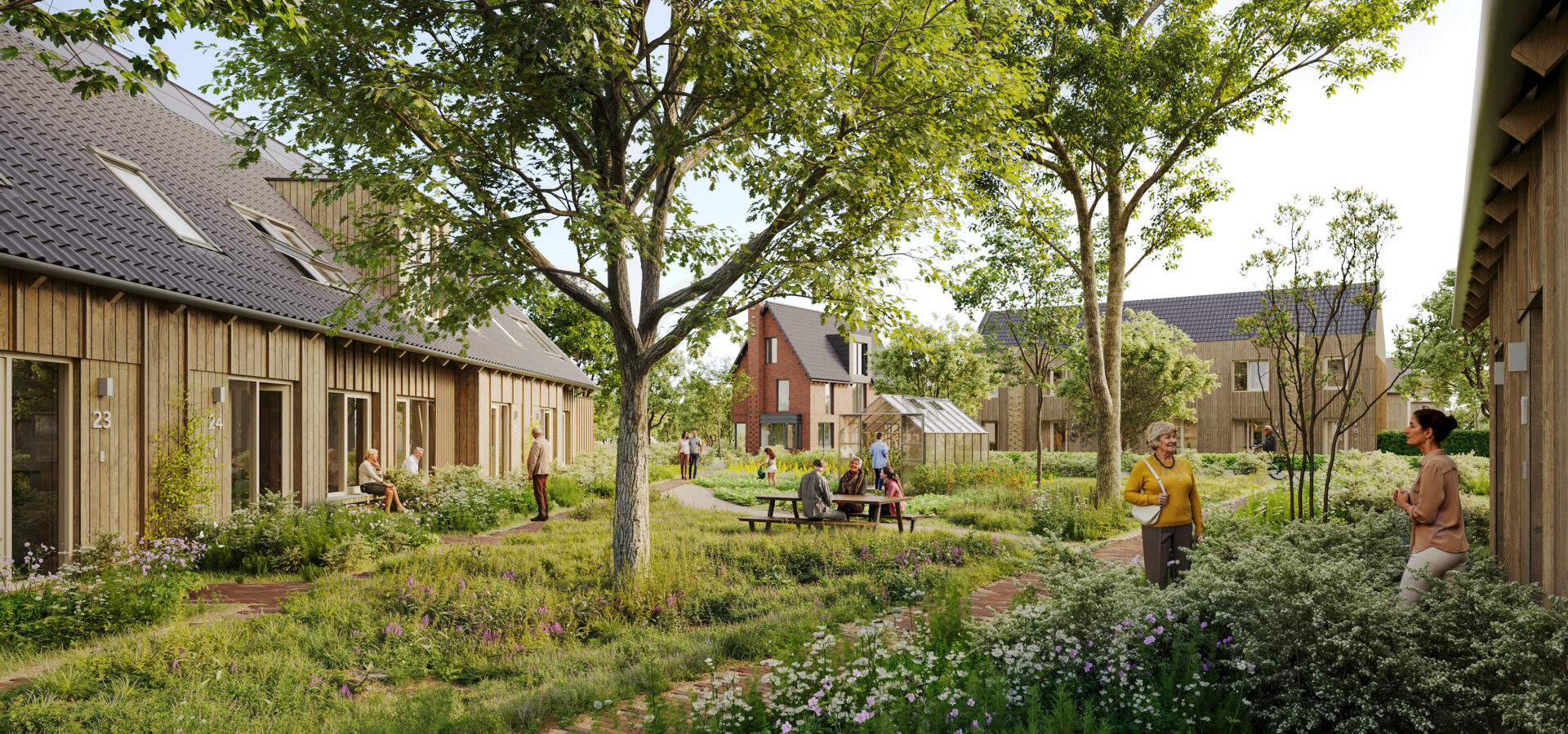 Wonen in het groen, waar de oorspronkelijke voortuinen als een collectieve groenstrook zijn ontworpen op natuurinclusiviteit en biodiversiteit en zijn ondergebracht in een VvE, die gezamenlijk zorgdraagt voor het beheer. In deze zone steken voor alle woningen natuurveranda’s als verblijfsplek aan het landschap waar natuurinclusiviteit en sociale cohesie optimaal zijn vormgegeven.