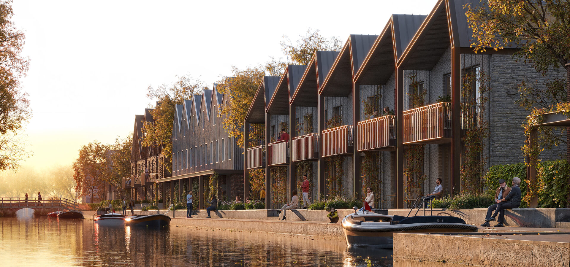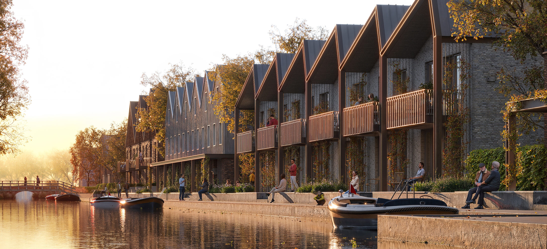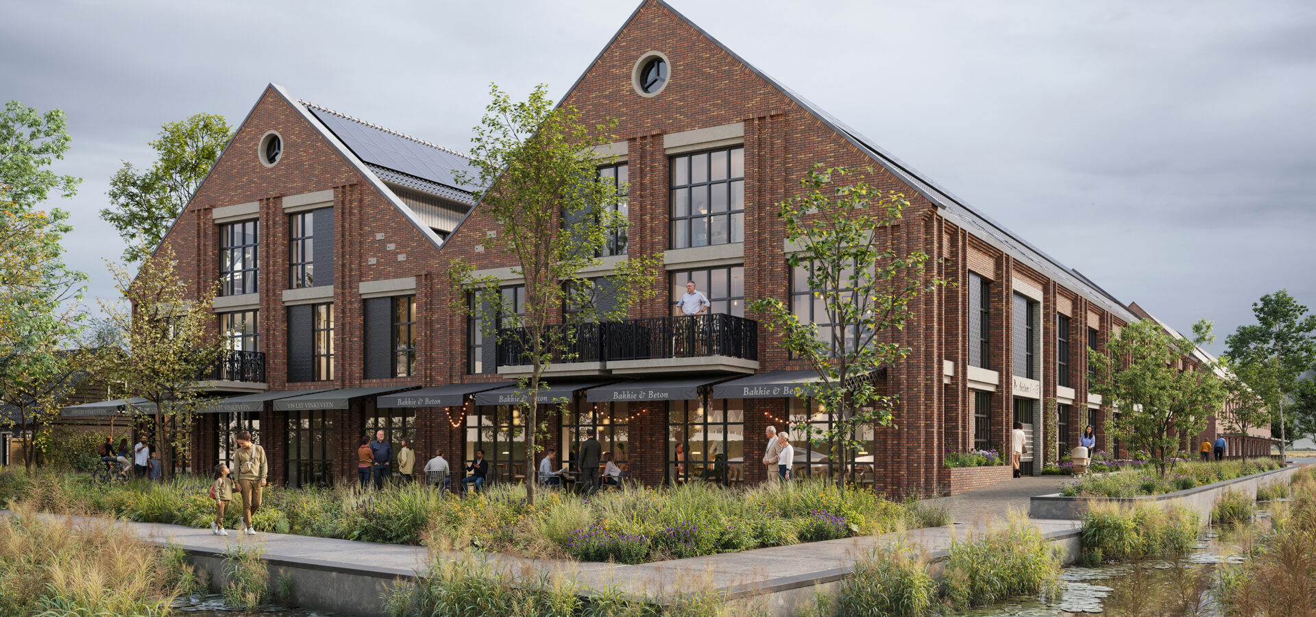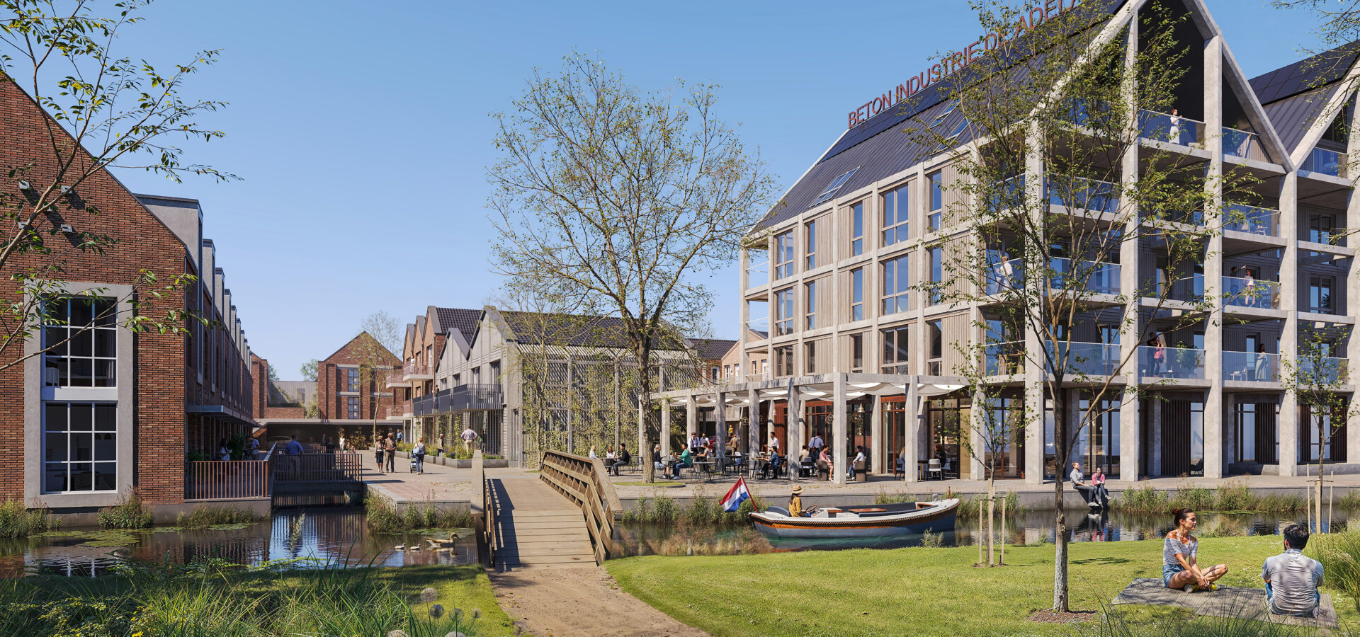 Langs de kade ontstaat een levendige ontmoetingsplek. Bewoners kunnen aan het water zitten, een boot aanleggen of uitkijken over de plassen. In de wijk keren de lange lijnen van het landschap terug in straten en dakrichtingen. Begane-grondwoningen krijgen verhoogde terrassen, afgeschermd met betonnen plantenbakken en klimgroen. Parkeren verdwijnt onder de gebouwen of op binnenterreinen. Blikvanger is een iconisch gebouw aan het water: een gevel met een ritmisch betonraster, verwijzend naar de voormalige opleggers van de fabriek.