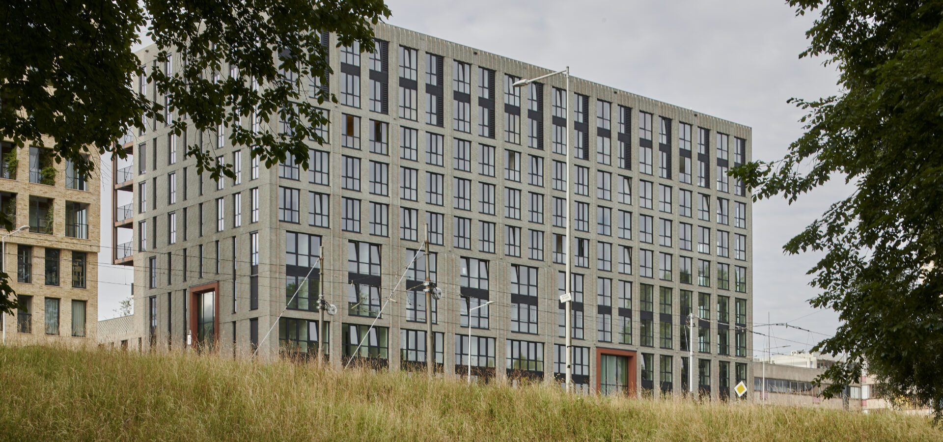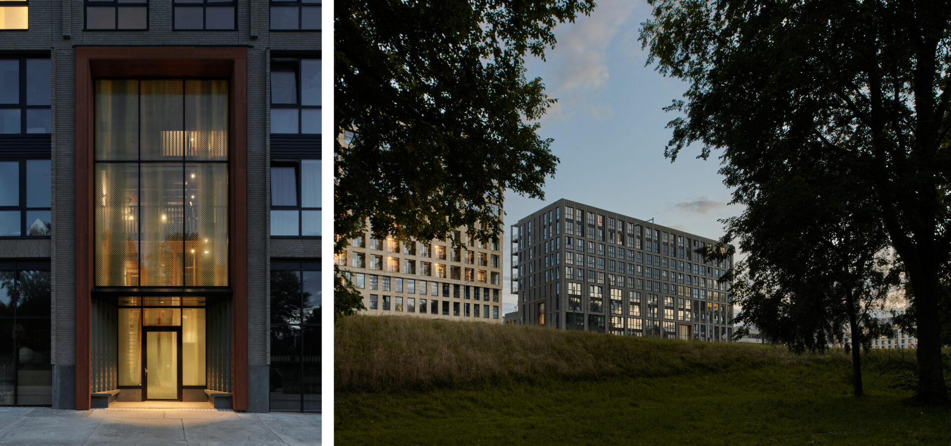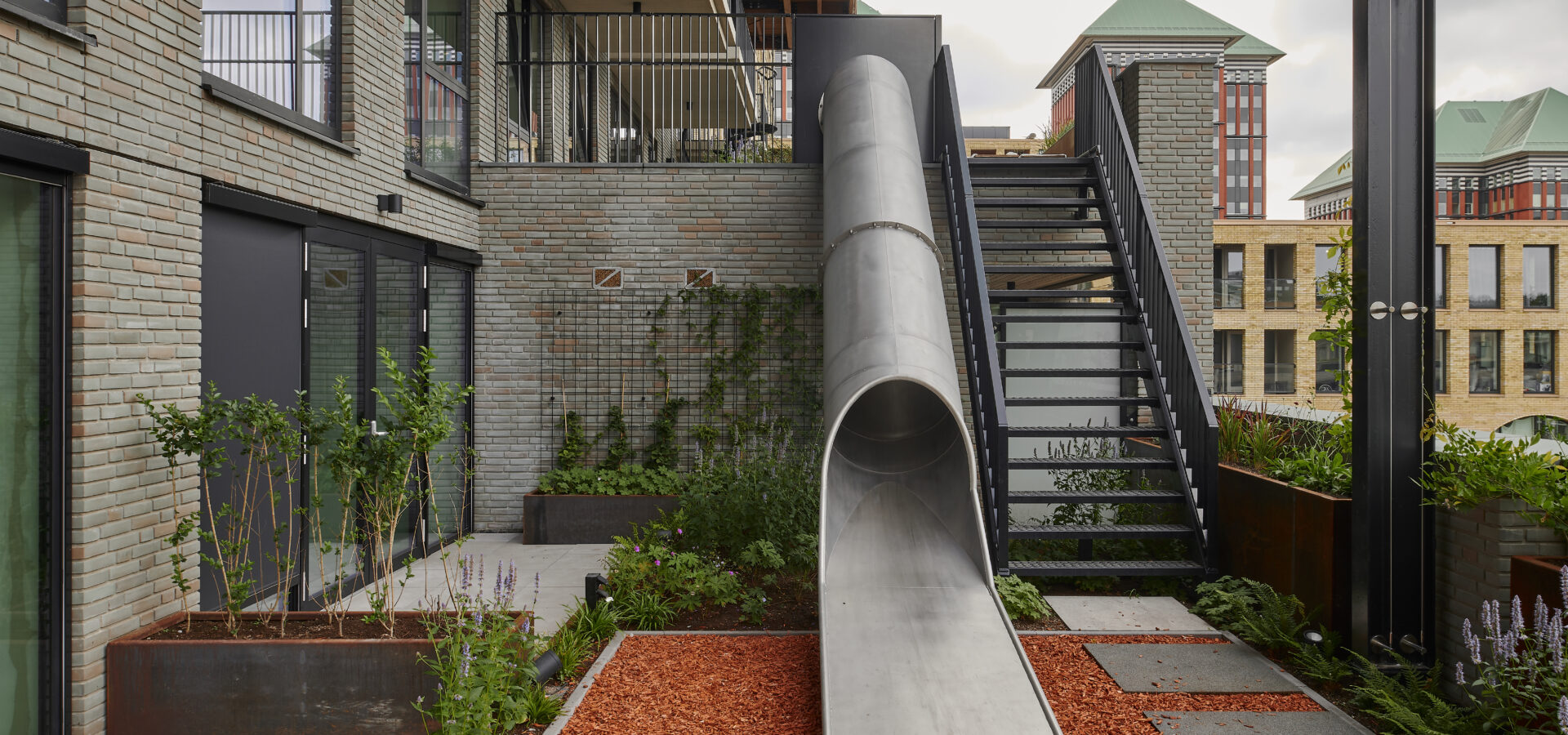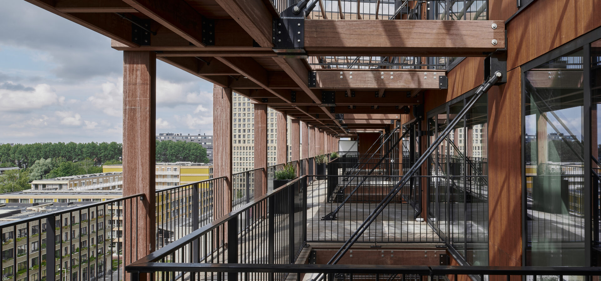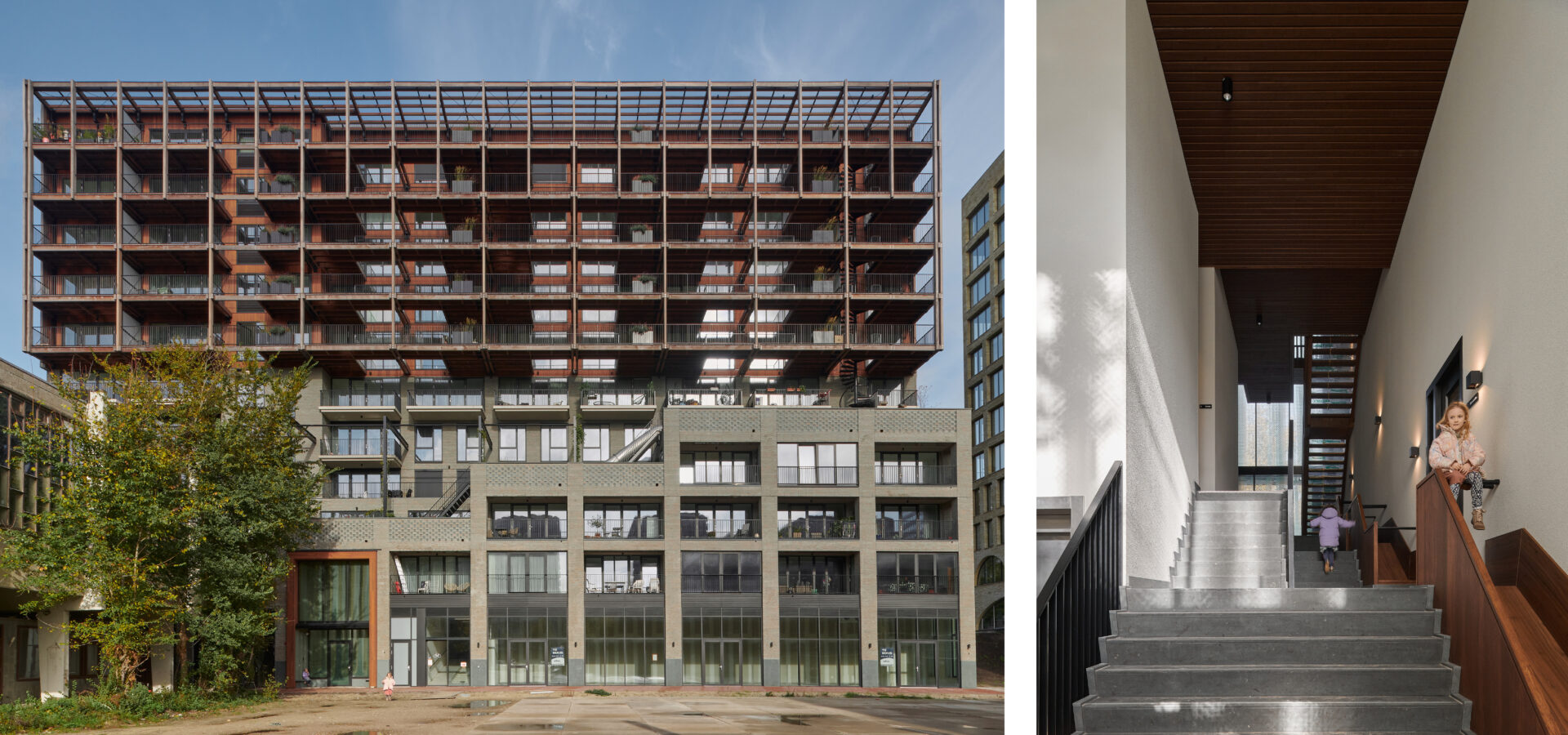 De houten ontsluitingsroute door het gebouw verwijst naar de galerijen van de naoorlogse strokenbouw – opnieuw ontworpen als een plek waar kinderen spelen en buren elkaar ontmoeten. De groene traptuin, ontworpen door Dijk & Co, maakt het ideaal van een stad in het groen tastbaar. Dankzij een slim irrigatiesysteem dat regenwater opvangt, blijft de beplanting het hele jaar door levendig.